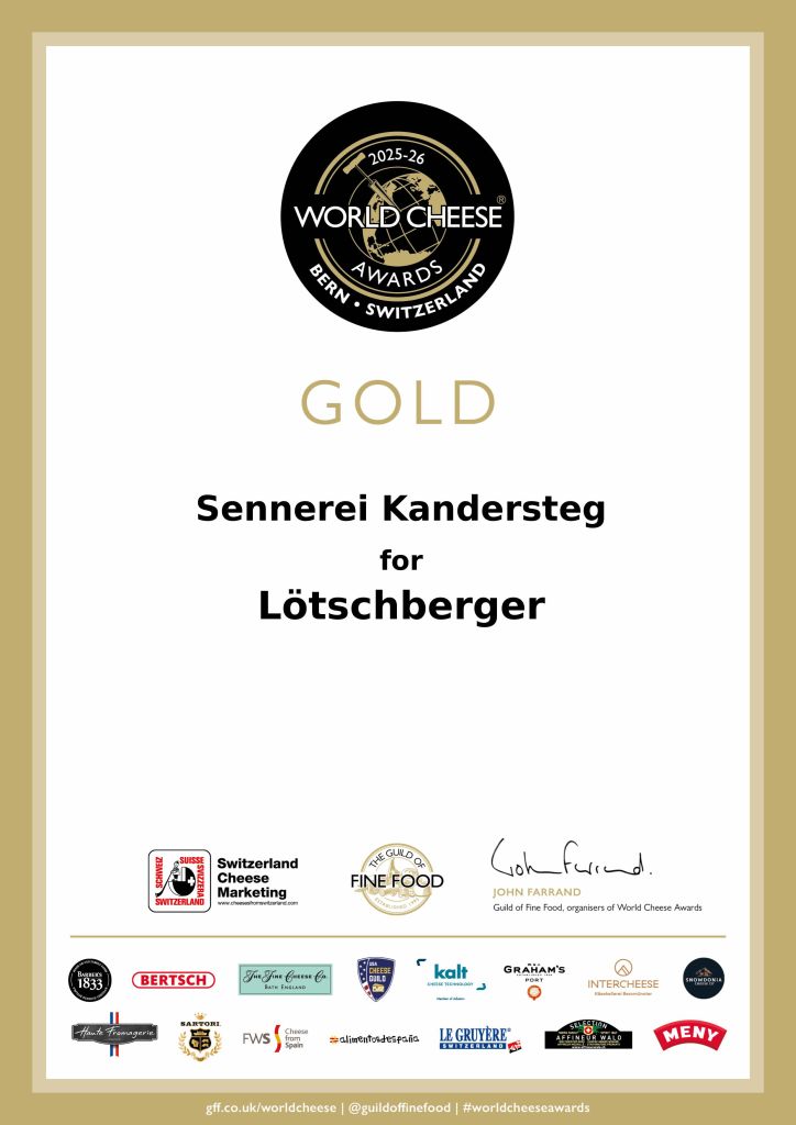 Wir freuen uns, dass unser Lötschberger bei den World Cheese Awards mit Gold ausgezeichnet wurde. Diese internationale Ehrung bestätigt unsere tägliche Arbeit mit regionaler Milch, traditionellem Handwerk und echter Leidenschaft.